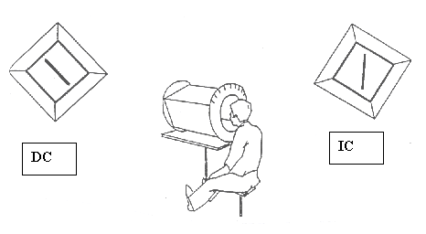 Figure 1a: Test du cadre et de la baguette (RFT): Les DC (dépendants au champ) ont tendance à aligner la baguette sur le cadre (schéma de gauche) alors que les IC (indépendants au champ) ont tendance à aligner la baguette sur la verticale gravitaire (schéma de droite).