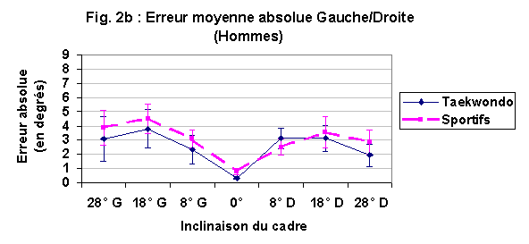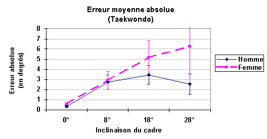 De plus, on trouve pour les hommes sportifs ou pratiquant le Taekwondo à haut niveau, une erreur absolue moyenne maximale pour une inclinaison du cadre de 18°. Pour les femmes (Taekwondo ou autres sportives), elle est à 28°. Cependant, en s'intéressant au comportement individuel des sujets, on trouve de fortes différences interindividuelles à l'intérieur d'un même groupe. On a remarqué que les erreurs maximales ne se faisaient pas pour tous les hommes à 18°, ni à 28° pour toutes les femmes (figure 3). Cette différence de proportion de sujets, suivant l'inclinaison du cadre, pourrait signer une différence entre les groupes.